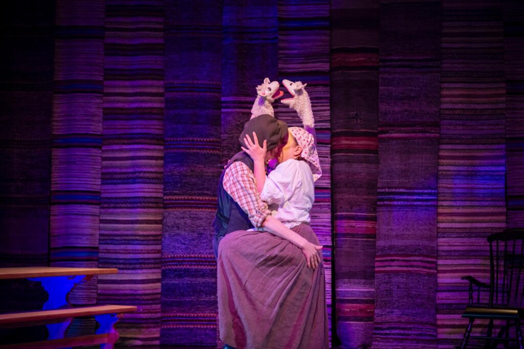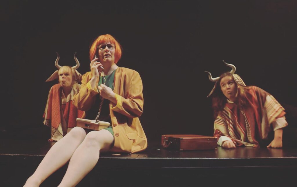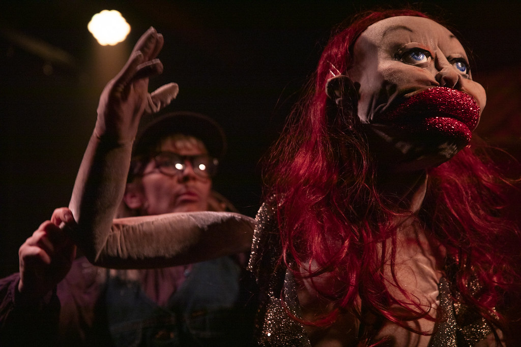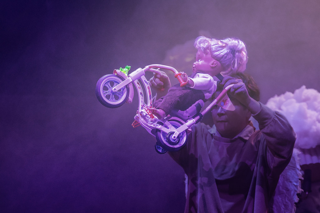 Autofiktiivisessa teoksessa on kuitenkin riemullisen puhdistavaa venyttää omat kipeätkin kokemukset fantasian puolelle ja pitää hauskaa. Nukketeatteri on paras muoto hauskan pitämisessä, sillä siellä melkein kaikki on yhtäkkiä mahdollista. Jos nukettajia olisi varaa palkata näyttämölle lisää, olisi moni kohtaus entistä villimpi! Humalan kämmenellä tarjosi niin nostalgisen leikkikentän 90-leluilla, että olin harjoituksissa jo huolissani vaarasta taantua takaisin lapseksi. Toisaalta koen olevani tässä ammatissa ikuisesti lapsi, joka leikkii ja koettaa hahmottaa elämää.