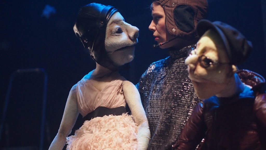 Ehkä se pienimuotoisuus tarjosi lähinnä keskittymisrauhaa olennaiseen. Mehän ei mennä esityksessä edes Tehtaan salin ääriin saakka, vaan pysytään varsin tiukasti yhden nuketuspöydän äärellä. Toisaalta olet ihan oikeassa: kun pimeän tilan keskelle laitetaan pienempi valaistu tila, niin se pimentoon jäävä alue varmasti muistuttaa suuresta tuntemattomasta. Pienuus antaa myös mahdollisuuden vaihtaa nopeasti mittakaavaa – varsin tärkeää tarinassa, jossa hahmot ovat sukelluslaivassa, joka seilaa suuren meren keskellä. Vanhanaikainen piirrosjälki ja vipstaakit musta tarjoavat lähinnä uskottavuutta, mehän väitetään esityksessä että ollaan koettu 1800-luvulla tapahtunut tarina täynnä uskomattomia keksintöjä… Ja se steam punk… sitä ei tähän tarinaan tarvinnut varsinaisesti tuoda, se vaan on!